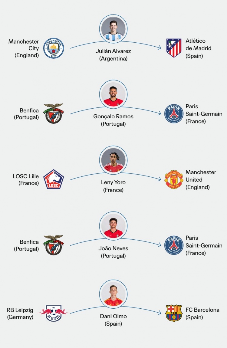 24年球员转会费排行:小蜘蛛7500万欧标王,G-拉莫斯&约罗二三位 1月31日讯 国际足联统计了2024年转会费最高的5笔引援,其中,阿尔瓦雷斯成为年度标王。2024年球员转会费排行榜↓(费用为德转数据)1、阿尔瓦雷斯(曼城→马竞)——7500万欧2、贡萨洛-拉莫斯( 2025/01/31