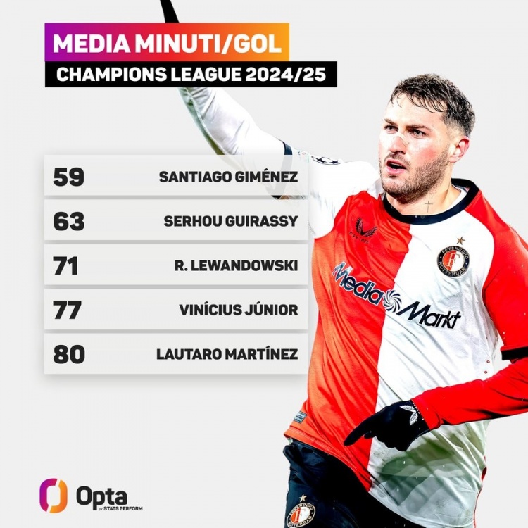 力压吉拉西、莱万!希门尼斯欧冠每59分钟进1球,本赛季效率最高 1月31日讯 米兰当前正在求购费耶诺德中锋圣地亚哥-希门尼斯,数据统计显示后者也是本赛季欧冠效率最高的射手。本赛季欧冠每进1球所需时间最少榜:(至少打进4球)59分钟,圣地亚哥-希门尼斯(费耶诺德)6 2025/01/31