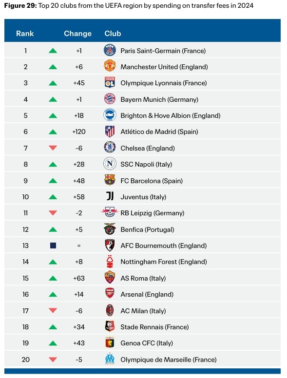 2024年欧足联俱乐部引援花销榜:巴黎、曼联、里昂、拜仁前四 1月31日讯 国际足联统计了2024年的世界足坛的引援花销榜,在欧足联俱乐部榜单上,巴黎圣日耳曼排名第一。2024年欧足联俱乐部引援花销榜:1、巴黎圣日耳曼2、曼联3、里昂4、拜仁5、布莱顿6、马竞7 2025/01/31