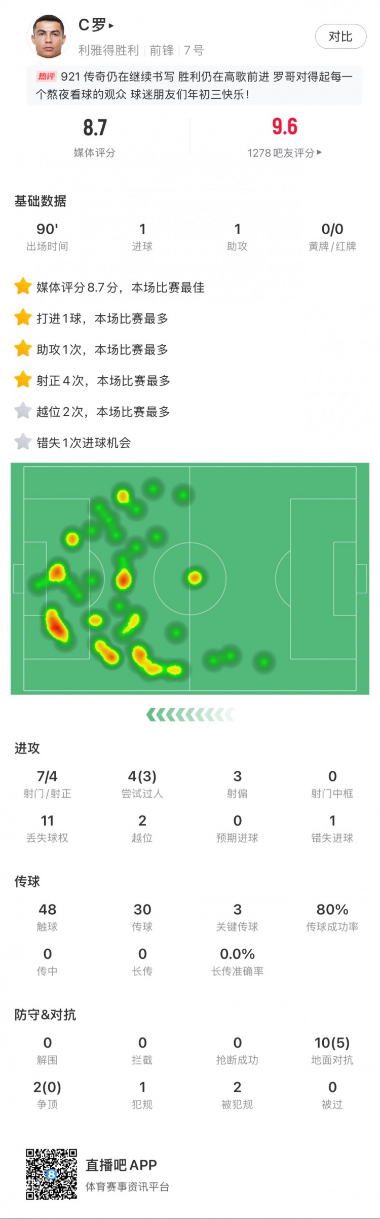 C罗全场数据:1球1助,7射4正,3次关键传球,获评8.7分最高 1月31日讯 沙特联第18轮,利雅得胜利客场2-1战胜布赖代先锋。C罗全场数据:1球1助7次射门4次射正4次过人3次成功错失1次得分机会48次触球30次传球24次成功3次关键传球创造1次得分机会10次 2025/01/31