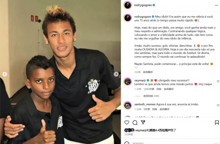 罗德里戈晒与内马尔旧照:我的偶像,希望你在桑托斯继续开心 1月31日讯 内马尔自宣回归桑托斯,罗德里戈晒出了15年前在内马尔在桑托斯的合照,向内马尔送上了祝福。罗德里戈表示道:“我的偶像!这大约是15年的照片,时间过得真快啊。如今,你不仅仅是一个偶像、一个朋 2025/01/31